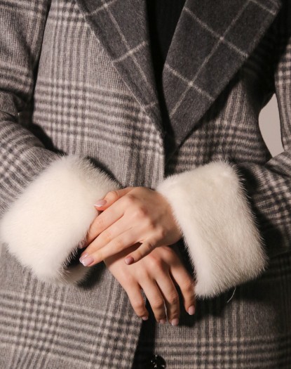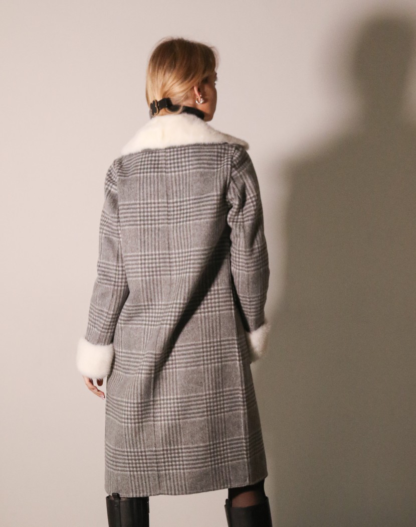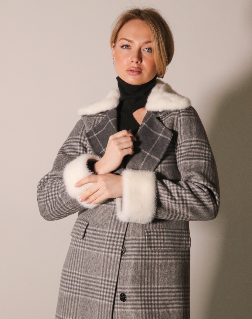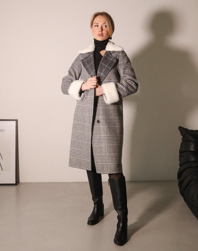 Пальто жіноче вовняне з норковим оздобленням та принтом (сіре)
